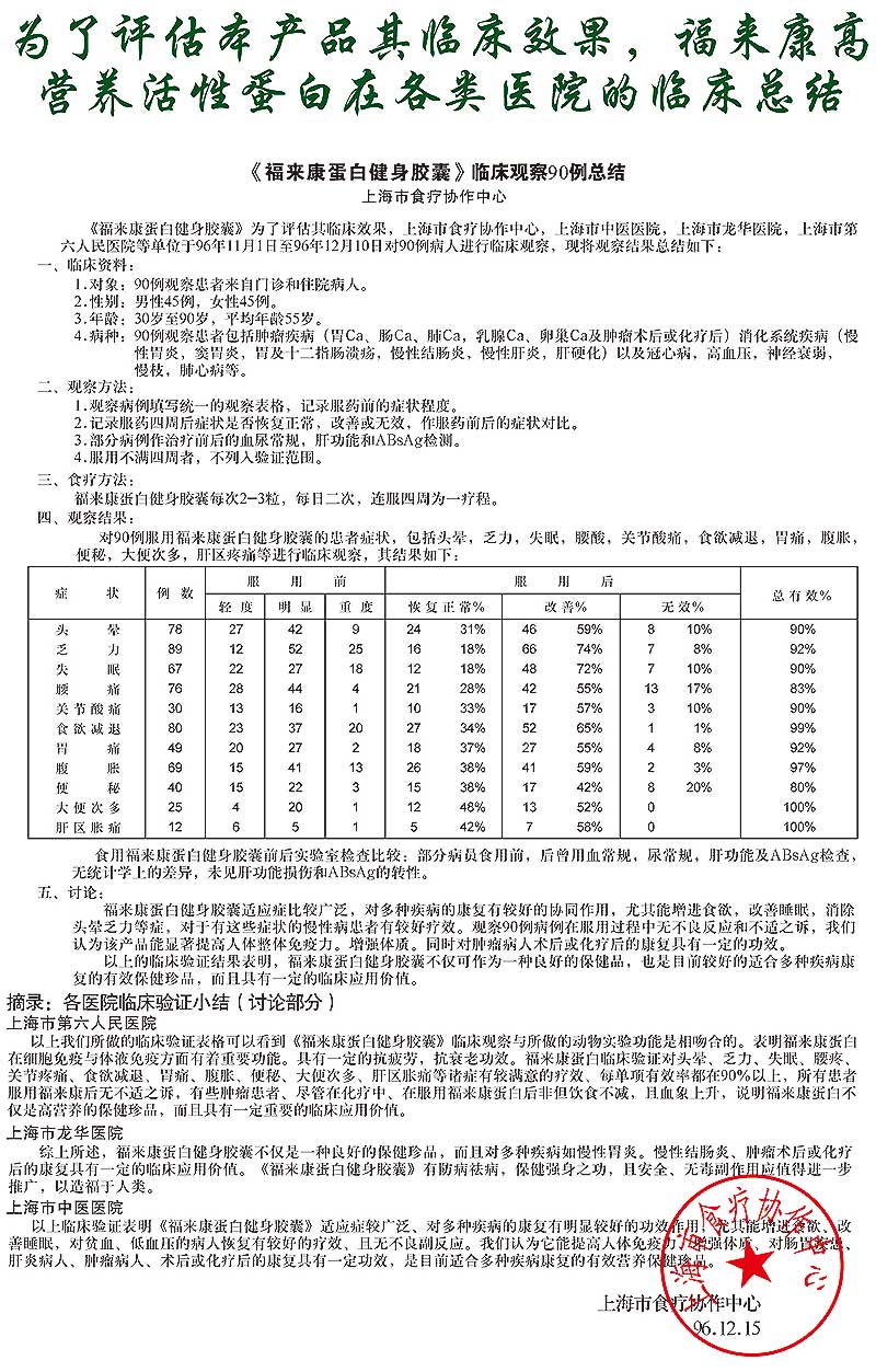 经中华人民共和国卫生部审核批准:福来康健身胶囊富含十八种以上氨基酸,其中含人体八种必须氨基酸,还含有活性蛋白酶等,经功能学试验证实,本品具有增强细胞免疫、体液免疫和巨噬细胞吞噬功能的作用。能明显提高机体对疾病的抗御能力。